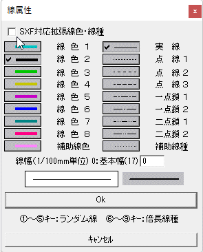 Jw_cad Ver.4.20以降では、SXF対応拡張線種という機能が新しく追加されています。しかし線種1~8のような一括設定画面はありませんし、プリンタ出力要素の設定もありません。