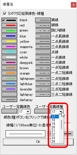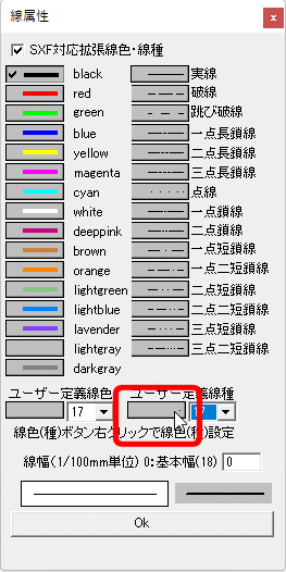 ユーザー定義線種を利用するには、まず、画面右下の「ユーザー定義線種」の下にある入力選択欄(コンボボックス)右横にある[▼]をクリックし、SXF線種番号を選択します。