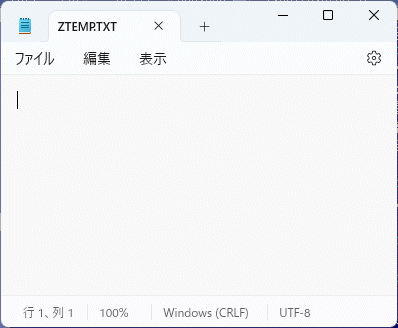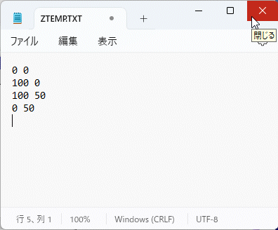 ②[ファイル編集]又は[新規ファイル]をクリックして下さい。環境設定で指定している外部エディタが実行されます。「ファイル編集」の場合は標準状態で、JWWフォルダ内の座標ファイル機能用一時ファイル「ZTEMP.TXT」が開きます。[新規ファイル]をクリックした場合は、外部エディタを新規状態で動かす事が出来ますがファイル名は指定無し状態となりますので注意して下さい(名前を付けて保存を行い、上記「ZTEMP.TXT」へ上書き保存を行って下さい)。